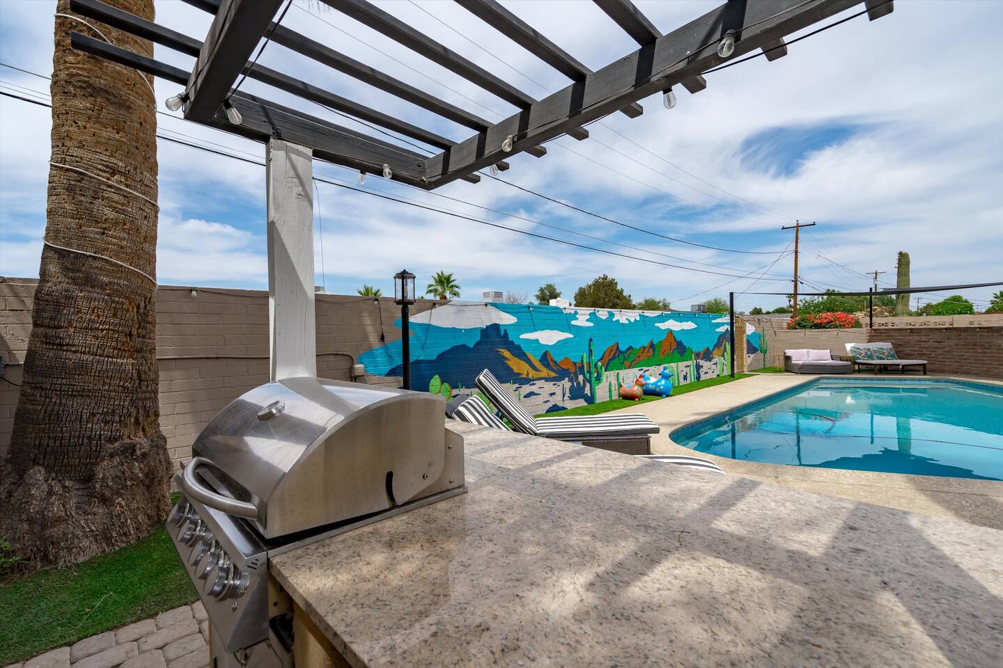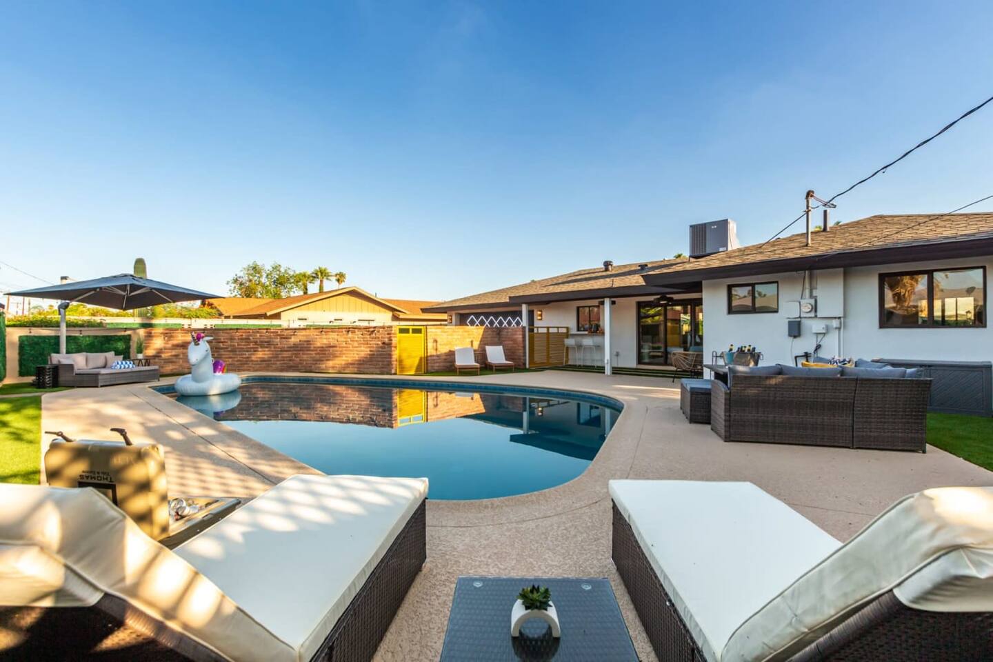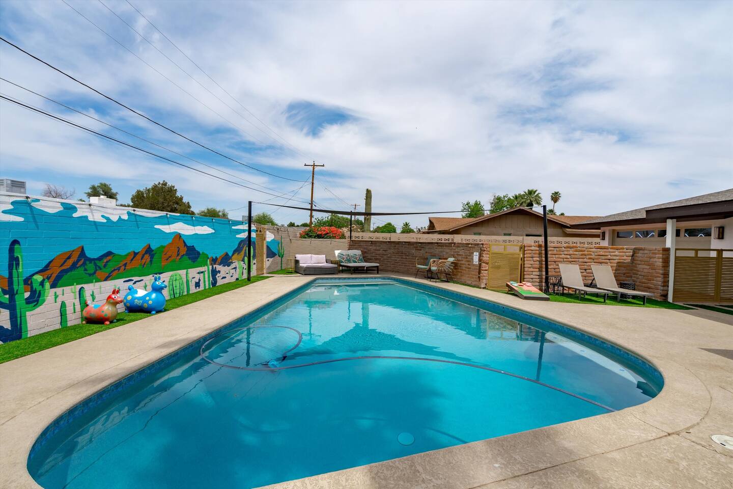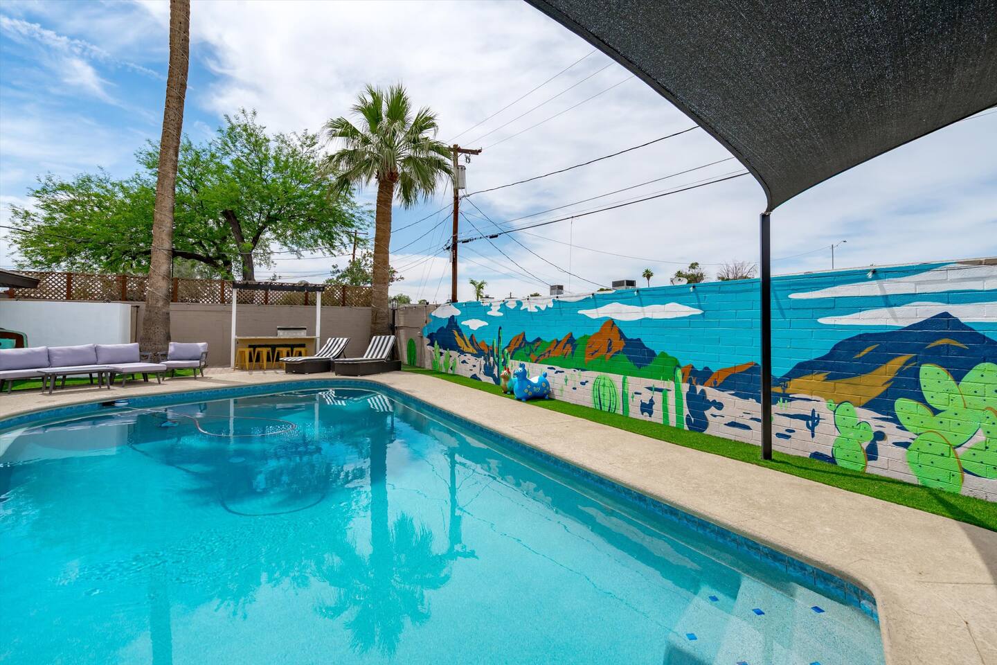 Chic and dazzling, every room will be your favorite. A modern open concept living makes it easy to relax and entertain. Two double sliding doors seamlessly unite inside with outside. The backyard oasis is outfitted with a "lounge couch", chaise loungers, giant sun-shade, backyard games, grill, wine/beer fridge, and additional seating areas. Inside, you'll find designer touches throughout. A spacious primary bedroom with en-suite bathroom is situated just off the main hallway. Three additional bedrooms, (all equipped with luxe finishes and bedding) are ready for your guests! The incredible living space features a wet bar with TV, oversized dining table, incredible chef's kitchen, and cozy living space. Smart TV's make this home "smart" to enjoy all of your favorite entertainment. This home's unbeatable location is just minutes from the best restaurants, nightlife, and shopping that Scottsdale has to offer. Catch an Uber or a scooter and you're back home in minutes. *Pool can be heated upon request (November to mid-May) with a minimum length of two days. Heating fee will be $200 for the minimum, and any additional days will be $100 per day. This is a very large pool and takes about a day to get up to temp, because of this we require a 2 day minimum. The Sleeping Arrangements: Primary Bedroom: (Soak up the Sun - Sleeps 2) -Comfortable King Bed with luxurious bedding -Plentiful closet storage + clothes hangers -55" mounted TV -Ceiling Fan -En Suite bathroom with luxe walk-in shower Queen Room 1 (Grateful Gray - Sleeps 2) -Queen Bed -Closet + Hangers -Ceiling Fan -Extra bedding, blankets, and pillows Queen Room 2: (Bohemian Blue - Sleeps 2) -Beautiful queen bed -Closet with hangers -Ceiling Fan -Extra bedding, blankets, and pillows Twin Room (Desert Destination - Sleeps 2) - 2 Twin XL beds -Closet with hangers -Ceiling fan -Extra bedding, blankets, and pillows Bathrooms: -Hotel Style toiletries - Soap, shampoo, conditioner, body wash, lotion -Make up towels -Hair Dryer -Kleenex Kitchen: -Keurig coffee machine allows for pod and drip coffee -Complimentary Keurig coffee pods, tea, creamer, sugar -Toaster/Microwave -Pots and Pans, bakeware, serving ware -All dinnerware, cutlery, and drinkware -New dish sponge, cleaning supplies, trash bags, dishwasher pods Pool/Backyard: -Giant Sun-Shade providing ample shade throughout the day -Umbrella over oversize "lounge couch" -Bistro Lights on Palm and Throughout Exterior -BBQ with Utensils and Bar Top -Yard Games (Cornhole, Ping Pong, Jenga) -Chaise Loungers (2 sets of 2) -Barstool seating around the BBQ Island Pool Area -Heated (up to 84 degrees, at an additional cost if wanted) -Gated pool deck -In Pool Lounge Chairs (BOTE) -Pool Towels -Bistro Lights -Pool Loungers -Large Sun Sail with plenty of shade -Umbrella Getting Ready Room (Laundry Room): -Extra large washing machine -Extra large dryer -Detergent and dryer sheets provided -Iron -Full length mirror -Additional make-up mirrors, washcloths, stools, etc. to be your most beautiful self Garage: -Ping Ping Table -Cornhole Boards -Jenga -Contemporary Lighting -PARKING! Extra long driveway with parking in rear We provide all the essentials so you can pack lighter (toilet paper, paper towels, hand soap, bath towels, shampoo, pool towels, mirrors, sheets and bedding and more). -Pack n Play and High-Chair at the listing at all times for for the little ones!! Guest access Access to the entire home except for owners closets.. - Washer and dryer in laundry/getting ready room (complimentary detergent and fabric softener) -This property and all guests must comply with AZ Senate Bill SB 1168, City of Scottsdale ordinance Sections 18 - 150, 18 - 121 and all state and city regulations. - Access to the property will require a security code which will be provided 24 hours prior along with check-in instructions. There is one security camera for the pool equipment in the backyard behind a wall. This only records the pool equipment so we can monitor for any issues remotely. - Scottsdale Short Term Rental License # 2025898…