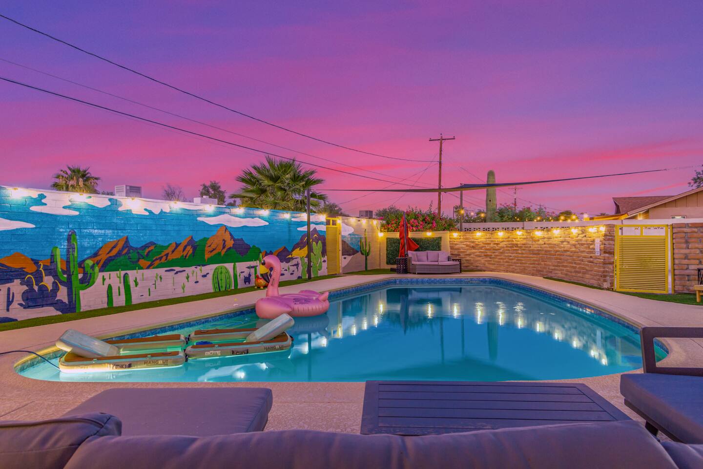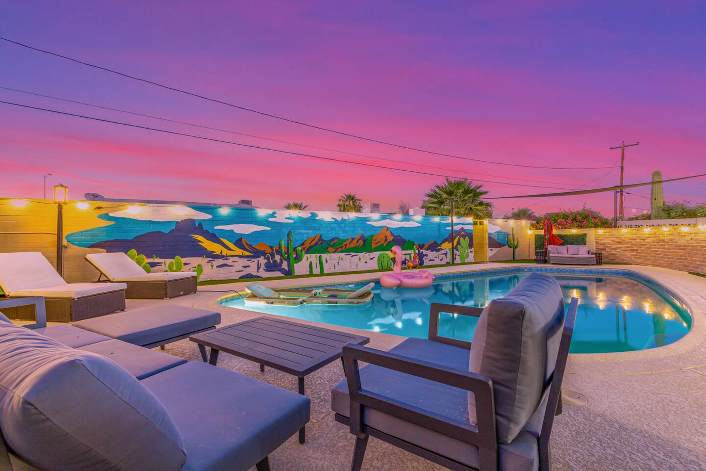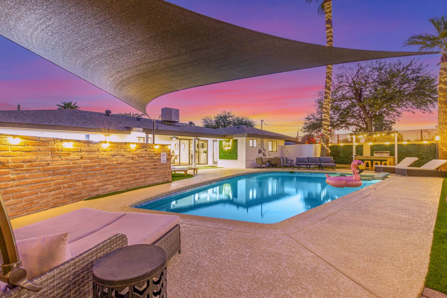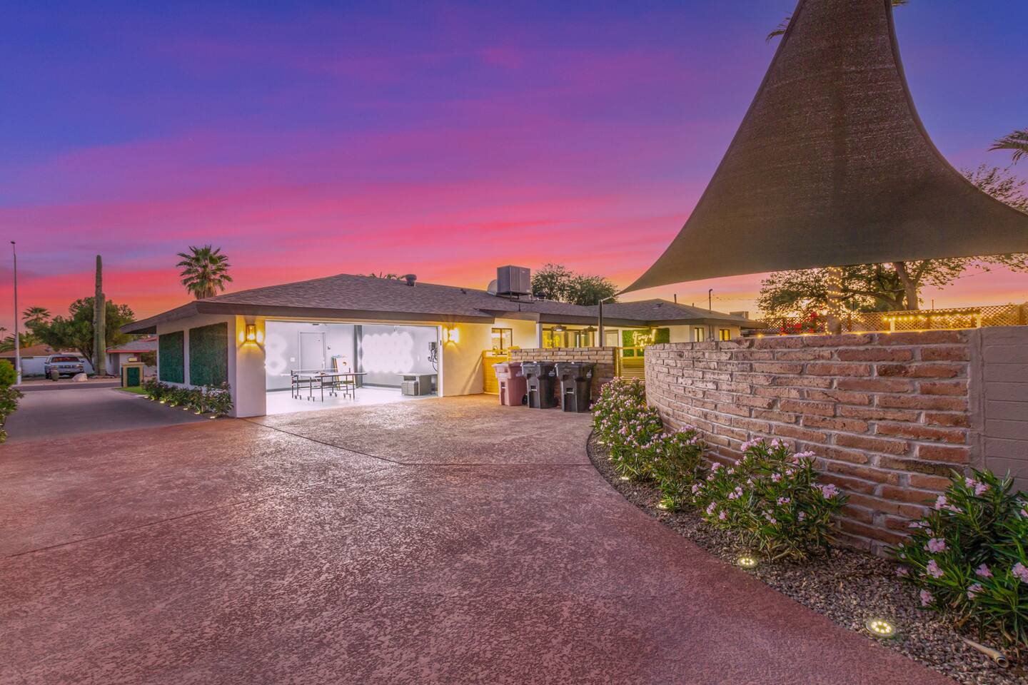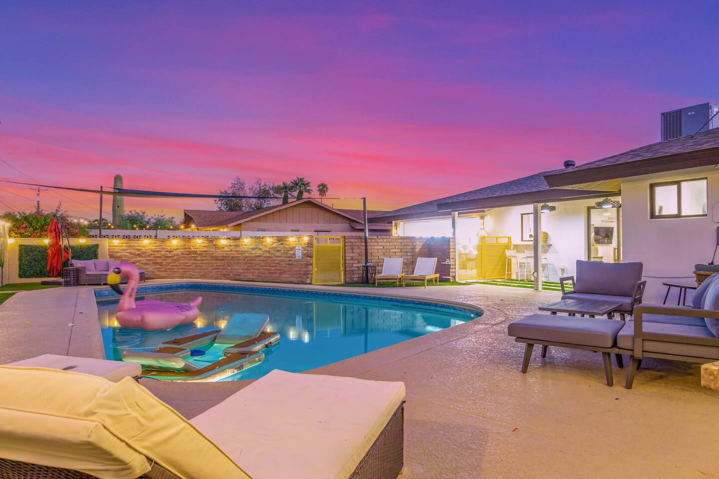 Chic and dazzling, every room will be your favorite. A modern open concept living makes it easy to relax and entertain. Two double sliding doors seamlessly unite inside with outside. The backyard oasis is outfitted with a "lounge couch", chaise loungers, giant sun-shade, backyard games, grill, wine/beer fridge, and additional seating areas. Inside, you'll find designer touches throughout. A spacious primary bedroom with en-suite bathroom is situated just off the main hallway. Three additional bedrooms, (all equipped with luxe finishes and bedding) are ready for your guests! The incredible living space features a wet bar with TV, oversized dining table, incredible chef's kitchen, and cozy living space. Smart TV's make this home "smart" to enjoy all of your favorite entertainment. This home's unbeatable location is just minutes from the best restaurants, nightlife, and shopping that Scottsdale has to offer. Catch an Uber or a scooter and you're back home in minutes. *Pool can be heated upon request (November to mid-May) with a minimum length of two days. Heating fee will be $200 for the minimum, and any additional days will be $100 per day. This is a very large pool and takes about a day to get up to temp, because of this we require a 2 day minimum. The Sleeping Arrangements: Primary Bedroom: (Soak up the Sun - Sleeps 2) -Comfortable King Bed with luxurious bedding -Plentiful closet storage + clothes hangers -55" mounted TV -Ceiling Fan -En Suite bathroom with luxe walk-in shower Queen Room 1 (Grateful Gray - Sleeps 2) -Queen Bed -Closet + Hangers -Ceiling Fan -Extra bedding, blankets, and pillows Queen Room 2: (Bohemian Blue - Sleeps 2) -Beautiful queen bed -Closet with hangers -Ceiling Fan -Extra bedding, blankets, and pillows Twin Room (Desert Destination - Sleeps 2) - 2 Twin XL beds -Closet with hangers -Ceiling fan -Extra bedding, blankets, and pillows Bathrooms: -Hotel Style toiletries - Soap, shampoo, conditioner, body wash, lotion -Make up towels -Hair Dryer -Kleenex Kitchen: -Keurig coffee machine allows for pod and drip coffee -Complimentary Keurig coffee pods, tea, creamer, sugar -Toaster/Microwave -Pots and Pans, bakeware, serving ware -All dinnerware, cutlery, and drinkware -New dish sponge, cleaning supplies, trash bags, dishwasher pods Pool/Backyard: -Giant Sun-Shade providing ample shade throughout the day -Umbrella over oversize "lounge couch" -Bistro Lights on Palm and Throughout Exterior -BBQ with Utensils and Bar Top -Yard Games (Cornhole, Ping Pong, Jenga) -Chaise Loungers (2 sets of 2) -Barstool seating around the BBQ Island Pool Area -Heated (up to 84 degrees, at an additional cost if wanted) -Gated pool deck -In Pool Lounge Chairs (BOTE) -Pool Towels -Bistro Lights -Pool Loungers -Large Sun Sail with plenty of shade -Umbrella Getting Ready Room (Laundry Room): -Extra large washing machine -Extra large dryer -Detergent and dryer sheets provided -Iron -Full length mirror -Additional make-up mirrors, washcloths, stools, etc. to be your most beautiful self Garage: -Ping Ping Table -Cornhole Boards -Jenga -Contemporary Lighting -PARKING! Extra long driveway with parking in rear We provide all the essentials so you can pack lighter (toilet paper, paper towels, hand soap, bath towels, shampoo, pool towels, mirrors, sheets and bedding and more). -Pack n Play and High-Chair at the listing at all times for for the little ones!! Guest access Access to the entire home except for owners closets.. - Washer and dryer in laundry/getting ready room (complimentary detergent and fabric softener) -This property and all guests must comply with AZ Senate Bill SB 1168, City of Scottsdale ordinance Sections 18 - 150, 18 - 121 and all state and city regulations. - Access to the property will require a security code which will be provided 24 hours prior along with check-in instructions. There is one security camera for the pool equipment in the backyard behind a wall. This only records the pool equipment so we can monitor for any issues remotely. - Scottsdale Short Term Rental License # 2025898…