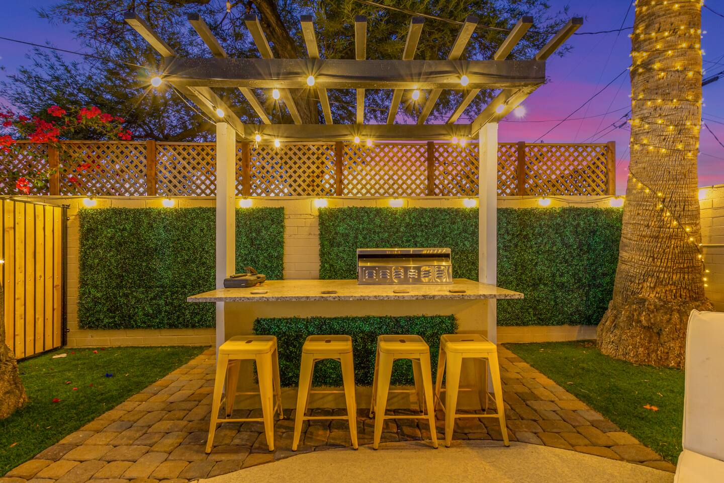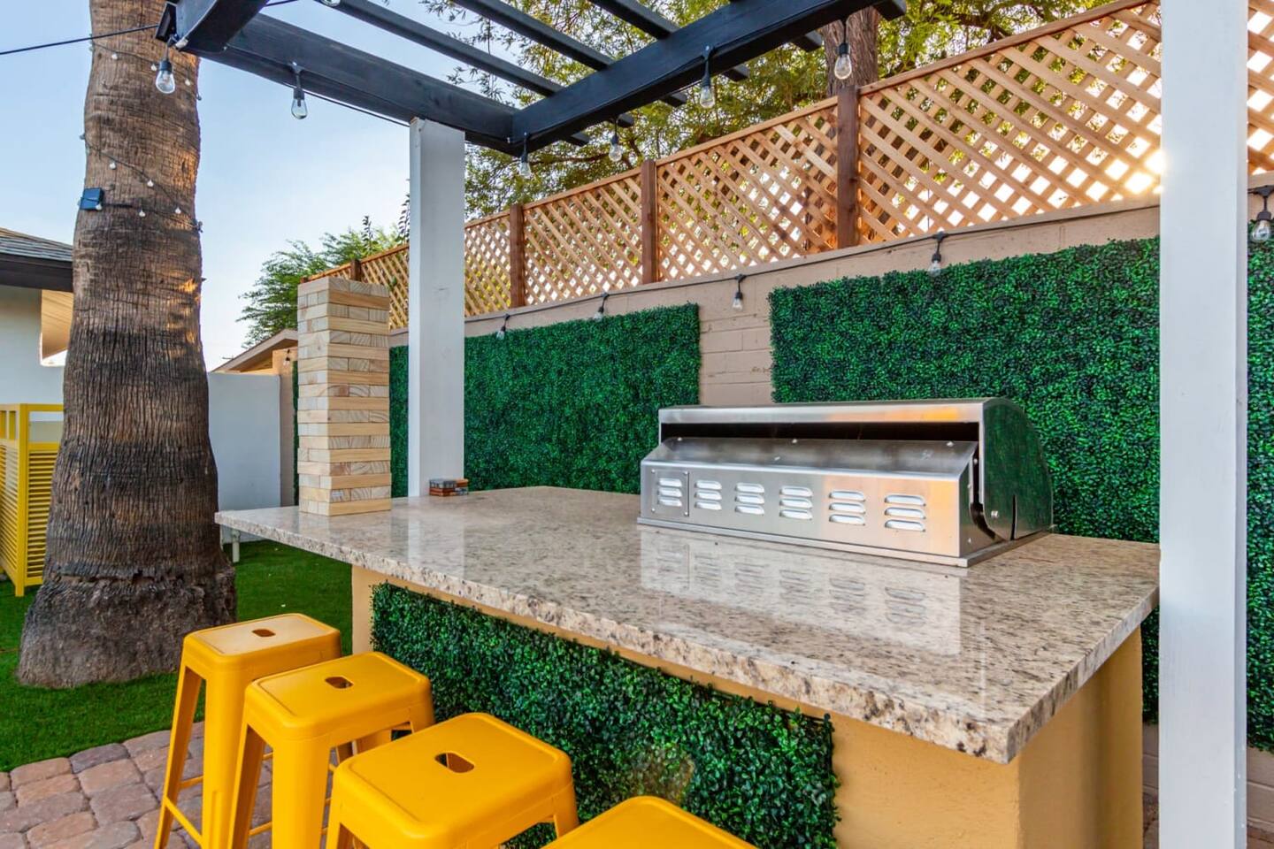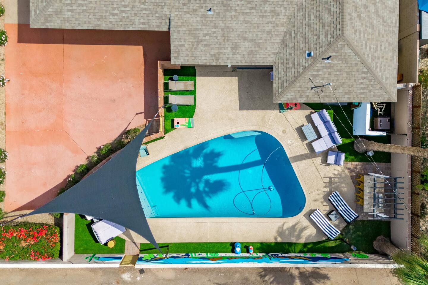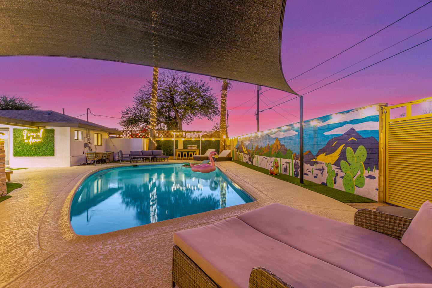 Chic and dazzling, every room will be your favorite. A modern open concept living makes it easy to relax and entertain. Two double sliding doors seamlessly unite inside with outside. The backyard oasis is outfitted with a "lounge couch", chaise loungers, giant sun-shade, backyard games, grill, wine/beer fridge, and additional seating areas. Inside, you'll find designer touches throughout. A spacious primary bedroom with en-suite bathroom is situated just off the main hallway. Three additional bedrooms, (all equipped with luxe finishes and bedding) are ready for your guests! The incredible living space features a wet bar with TV, oversized dining table, incredible chef's kitchen, and cozy living space. Smart TV's make this home "smart" to enjoy all of your favorite entertainment. This home's unbeatable location is just minutes from the best restaurants, nightlife, and shopping that Scottsdale has to offer. Catch an Uber or a scooter and you're back home in minutes. *Pool can be heated upon request (November to mid-May) with a minimum length of two days. Heating fee will be $200 for the minimum, and any additional days will be $100 per day. This is a very large pool and takes about a day to get up to temp, because of this we require a 2 day minimum. The Sleeping Arrangements: Primary Bedroom: (Soak up the Sun - Sleeps 2) -Comfortable King Bed with luxurious bedding -Plentiful closet storage + clothes hangers -55" mounted TV -Ceiling Fan -En Suite bathroom with luxe walk-in shower Queen Room 1 (Grateful Gray - Sleeps 2) -Queen Bed -Closet + Hangers -Ceiling Fan -Extra bedding, blankets, and pillows Queen Room 2: (Bohemian Blue - Sleeps 2) -Beautiful queen bed -Closet with hangers -Ceiling Fan -Extra bedding, blankets, and pillows Twin Room (Desert Destination - Sleeps 2) - 2 Twin XL beds -Closet with hangers -Ceiling fan -Extra bedding, blankets, and pillows Bathrooms: -Hotel Style toiletries - Soap, shampoo, conditioner, body wash, lotion -Make up towels -Hair Dryer -Kleenex Kitchen: -Keurig coffee machine allows for pod and drip coffee -Complimentary Keurig coffee pods, tea, creamer, sugar -Toaster/Microwave -Pots and Pans, bakeware, serving ware -All dinnerware, cutlery, and drinkware -New dish sponge, cleaning supplies, trash bags, dishwasher pods Pool/Backyard: -Giant Sun-Shade providing ample shade throughout the day -Umbrella over oversize "lounge couch" -Bistro Lights on Palm and Throughout Exterior -BBQ with Utensils and Bar Top -Yard Games (Cornhole, Ping Pong, Jenga) -Chaise Loungers (2 sets of 2) -Barstool seating around the BBQ Island Pool Area -Heated (up to 84 degrees, at an additional cost if wanted) -Gated pool deck -In Pool Lounge Chairs (BOTE) -Pool Towels -Bistro Lights -Pool Loungers -Large Sun Sail with plenty of shade -Umbrella Getting Ready Room (Laundry Room): -Extra large washing machine -Extra large dryer -Detergent and dryer sheets provided -Iron -Full length mirror -Additional make-up mirrors, washcloths, stools, etc. to be your most beautiful self Garage: -Ping Ping Table -Cornhole Boards -Jenga -Contemporary Lighting -PARKING! Extra long driveway with parking in rear We provide all the essentials so you can pack lighter (toilet paper, paper towels, hand soap, bath towels, shampoo, pool towels, mirrors, sheets and bedding and more). -Pack n Play and High-Chair at the listing at all times for for the little ones!! Guest access Access to the entire home except for owners closets.. - Washer and dryer in laundry/getting ready room (complimentary detergent and fabric softener) -This property and all guests must comply with AZ Senate Bill SB 1168, City of Scottsdale ordinance Sections 18 - 150, 18 - 121 and all state and city regulations. - Access to the property will require a security code which will be provided 24 hours prior along with check-in instructions. There is one security camera for the pool equipment in the backyard behind a wall. This only records the pool equipment so we can monitor for any issues remotely. - Scottsdale Short Term Rental License # 2025898…