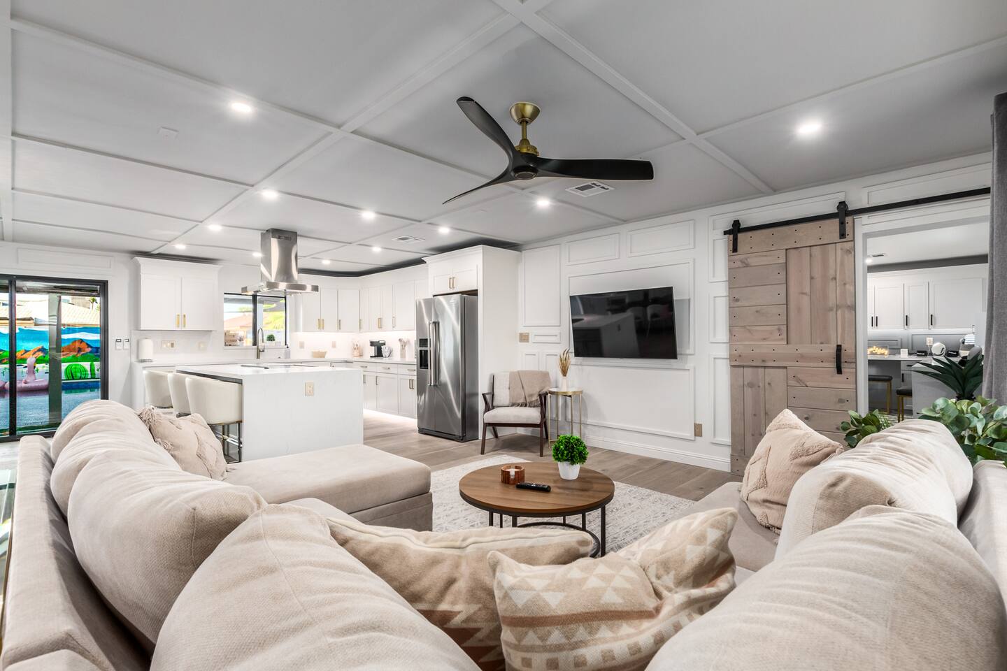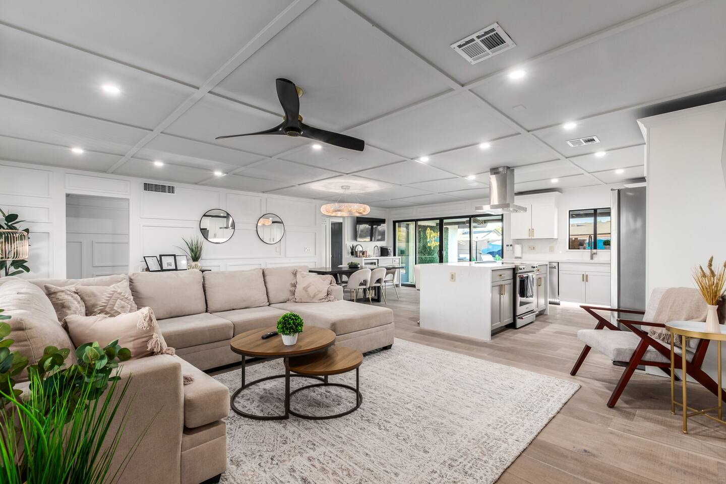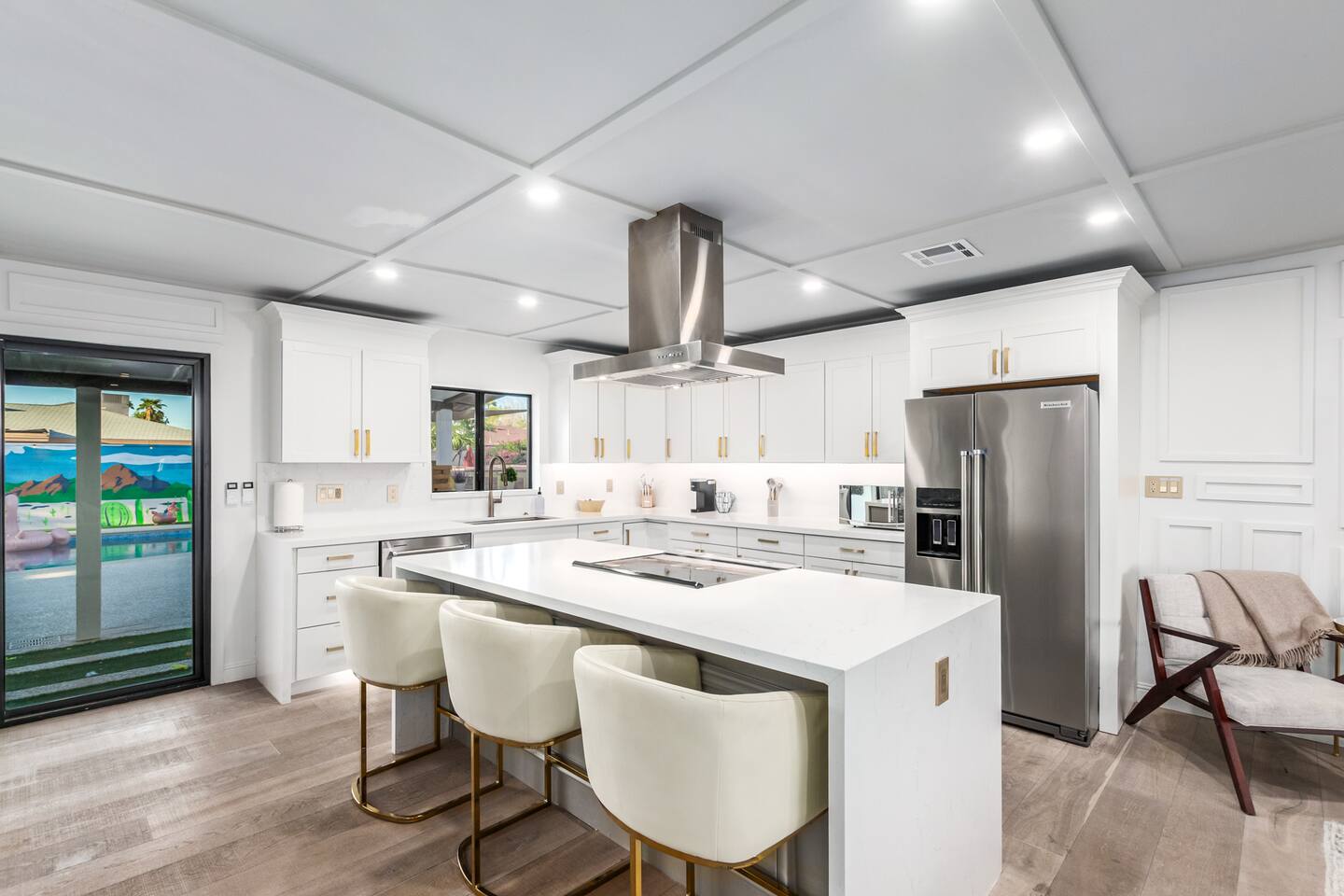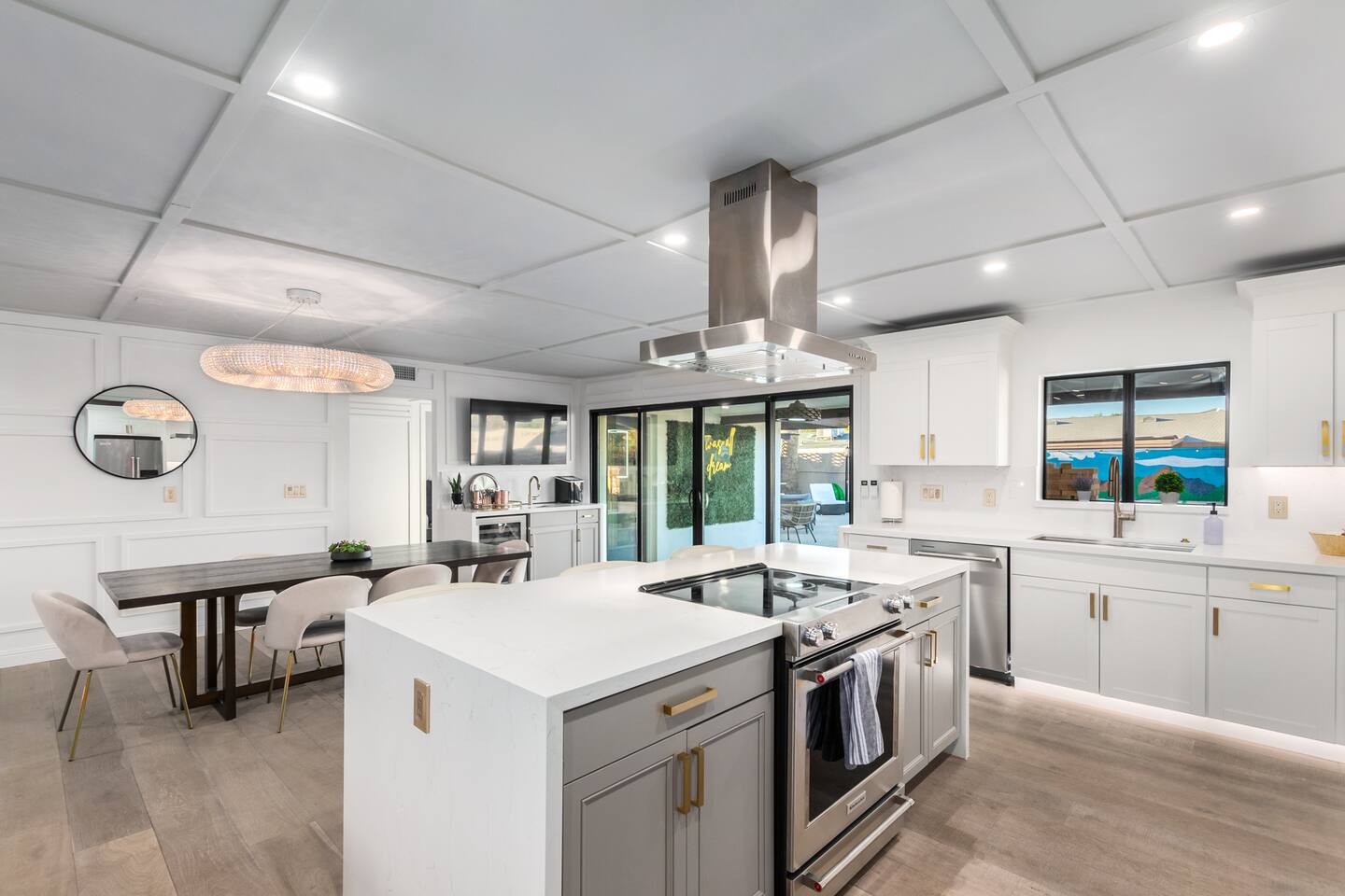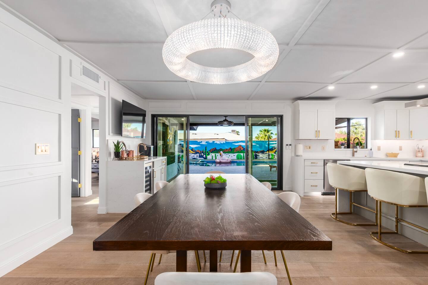 Chic and dazzling, every room will be your favorite. A modern open concept living makes it easy to relax and entertain. Two double sliding doors seamlessly unite inside with outside. The backyard oasis is outfitted with a "lounge couch", chaise loungers, giant sun-shade, backyard games, grill, wine/beer fridge, and additional seating areas. Inside, you'll find designer touches throughout. A spacious primary bedroom with en-suite bathroom is situated just off the main hallway. Three additional bedrooms, (all equipped with luxe finishes and bedding) are ready for your guests! The incredible living space features a wet bar with TV, oversized dining table, incredible chef's kitchen, and cozy living space. Smart TV's make this home "smart" to enjoy all of your favorite entertainment. This home's unbeatable location is just minutes from the best restaurants, nightlife, and shopping that Scottsdale has to offer. Catch an Uber or a scooter and you're back home in minutes. *Pool can be heated upon request (November to mid-May) with a minimum length of two days. Heating fee will be $200 for the minimum, and any additional days will be $100 per day. This is a very large pool and takes about a day to get up to temp, because of this we require a 2 day minimum. The Sleeping Arrangements: Primary Bedroom: (Soak up the Sun - Sleeps 2) -Comfortable King Bed with luxurious bedding -Plentiful closet storage + clothes hangers -55" mounted TV -Ceiling Fan -En Suite bathroom with luxe walk-in shower Queen Room 1 (Grateful Gray - Sleeps 2) -Queen Bed -Closet + Hangers -Ceiling Fan -Extra bedding, blankets, and pillows Queen Room 2: (Bohemian Blue - Sleeps 2) -Beautiful queen bed -Closet with hangers -Ceiling Fan -Extra bedding, blankets, and pillows Twin Room (Desert Destination - Sleeps 2) - 2 Twin XL beds -Closet with hangers -Ceiling fan -Extra bedding, blankets, and pillows Bathrooms: -Hotel Style toiletries - Soap, shampoo, conditioner, body wash, lotion -Make up towels -Hair Dryer -Kleenex Kitchen: -Keurig coffee machine allows for pod and drip coffee -Complimentary Keurig coffee pods, tea, creamer, sugar -Toaster/Microwave -Pots and Pans, bakeware, serving ware -All dinnerware, cutlery, and drinkware -New dish sponge, cleaning supplies, trash bags, dishwasher pods Pool/Backyard: -Giant Sun-Shade providing ample shade throughout the day -Umbrella over oversize "lounge couch" -Bistro Lights on Palm and Throughout Exterior -BBQ with Utensils and Bar Top -Yard Games (Cornhole, Ping Pong, Jenga) -Chaise Loungers (2 sets of 2) -Barstool seating around the BBQ Island Pool Area -Heated (up to 84 degrees, at an additional cost if wanted) -Gated pool deck -In Pool Lounge Chairs (BOTE) -Pool Towels -Bistro Lights -Pool Loungers -Large Sun Sail with plenty of shade -Umbrella Getting Ready Room (Laundry Room): -Extra large washing machine -Extra large dryer -Detergent and dryer sheets provided -Iron -Full length mirror -Additional make-up mirrors, washcloths, stools, etc. to be your most beautiful self Garage: -Ping Ping Table -Cornhole Boards -Jenga -Contemporary Lighting -PARKING! Extra long driveway with parking in rear We provide all the essentials so you can pack lighter (toilet paper, paper towels, hand soap, bath towels, shampoo, pool towels, mirrors, sheets and bedding and more). -Pack n Play and High-Chair at the listing at all times for for the little ones!! Guest access Access to the entire home except for owners closets.. - Washer and dryer in laundry/getting ready room (complimentary detergent and fabric softener) -This property and all guests must comply with AZ Senate Bill SB 1168, City of Scottsdale ordinance Sections 18 - 150, 18 - 121 and all state and city regulations. - Access to the property will require a security code which will be provided 24 hours prior along with check-in instructions. There is one security camera for the pool equipment in the backyard behind a wall. This only records the pool equipment so we can monitor for any issues remotely. - Scottsdale Short Term Rental License # 2025898…