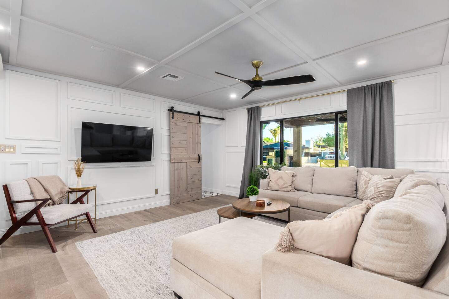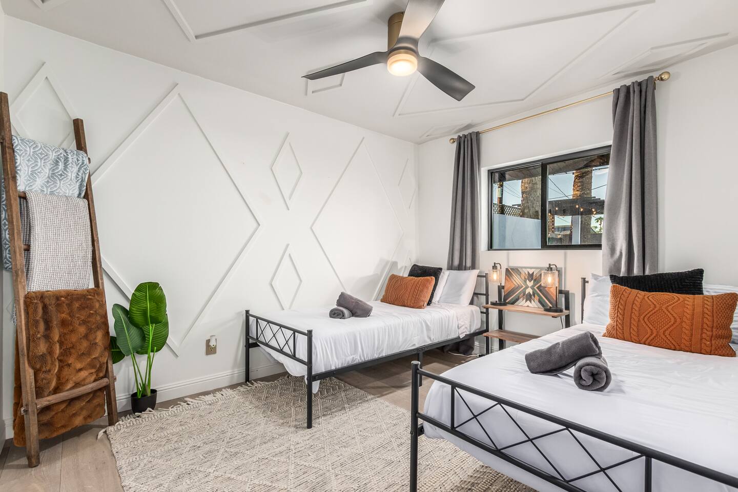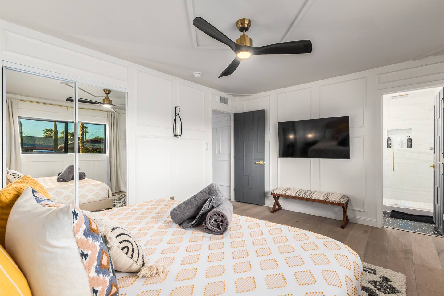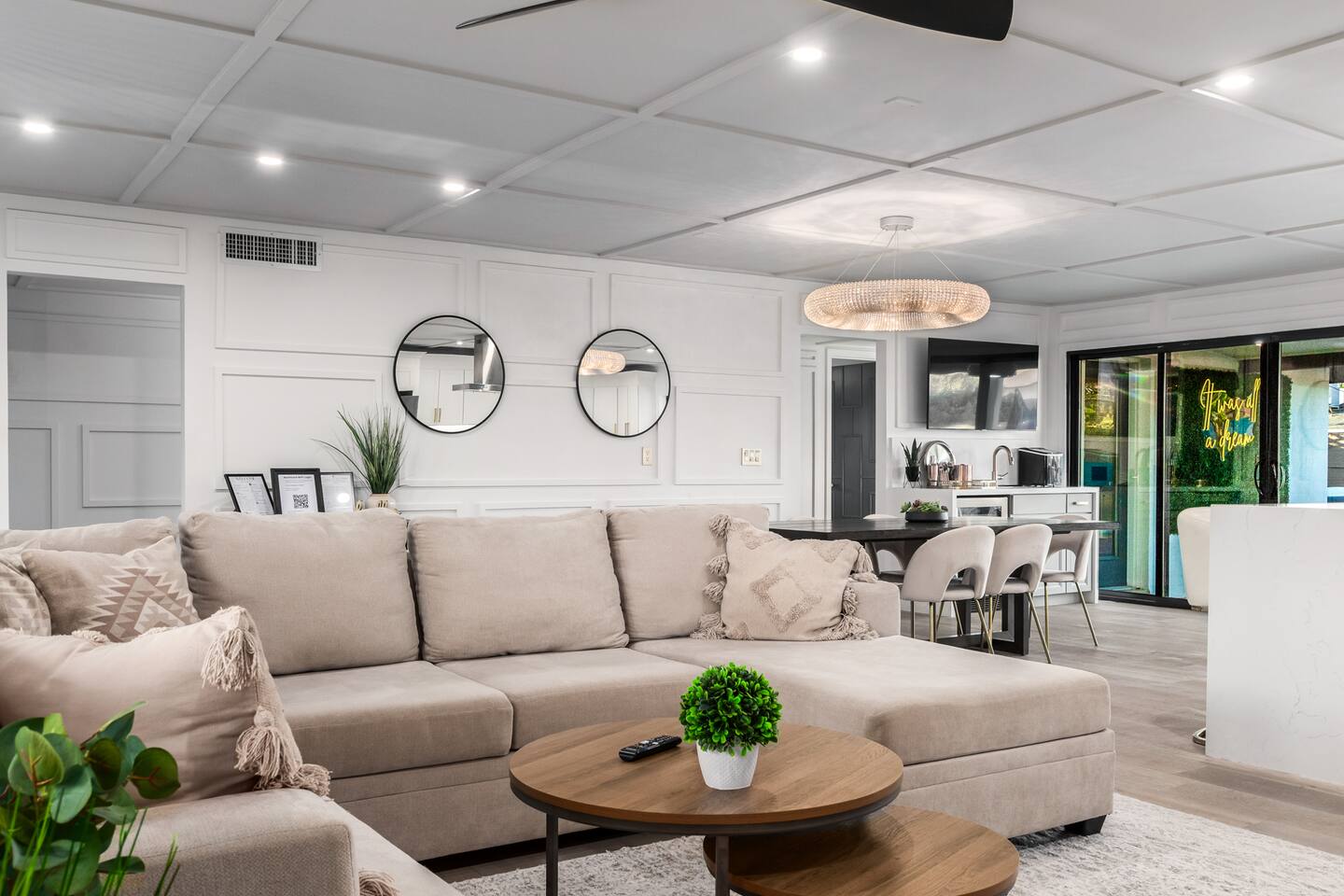 Chic and dazzling, every room will be your favorite. A modern open concept living makes it easy to relax and entertain. Two double sliding doors seamlessly unite inside with outside. The backyard oasis is outfitted with a "lounge couch", chaise loungers, giant sun-shade, backyard games, grill, wine/beer fridge, and additional seating areas. Inside, you'll find designer touches throughout. A spacious primary bedroom with en-suite bathroom is situated just off the main hallway. Three additional bedrooms, (all equipped with luxe finishes and bedding) are ready for your guests! The incredible living space features a wet bar with TV, oversized dining table, incredible chef's kitchen, and cozy living space. Smart TV's make this home "smart" to enjoy all of your favorite entertainment. This home's unbeatable location is just minutes from the best restaurants, nightlife, and shopping that Scottsdale has to offer. Catch an Uber or a scooter and you're back home in minutes. *Pool can be heated upon request (November to mid-May) with a minimum length of two days. Heating fee will be $200 for the minimum, and any additional days will be $100 per day. This is a very large pool and takes about a day to get up to temp, because of this we require a 2 day minimum. The Sleeping Arrangements: Primary Bedroom: (Soak up the Sun - Sleeps 2) -Comfortable King Bed with luxurious bedding -Plentiful closet storage + clothes hangers -55" mounted TV -Ceiling Fan -En Suite bathroom with luxe walk-in shower Queen Room 1 (Grateful Gray - Sleeps 2) -Queen Bed -Closet + Hangers -Ceiling Fan -Extra bedding, blankets, and pillows Queen Room 2: (Bohemian Blue - Sleeps 2) -Beautiful queen bed -Closet with hangers -Ceiling Fan -Extra bedding, blankets, and pillows Twin Room (Desert Destination - Sleeps 2) - 2 Twin XL beds -Closet with hangers -Ceiling fan -Extra bedding, blankets, and pillows Bathrooms: -Hotel Style toiletries - Soap, shampoo, conditioner, body wash, lotion -Make up towels -Hair Dryer -Kleenex Kitchen: -Keurig coffee machine allows for pod and drip coffee -Complimentary Keurig coffee pods, tea, creamer, sugar -Toaster/Microwave -Pots and Pans, bakeware, serving ware -All dinnerware, cutlery, and drinkware -New dish sponge, cleaning supplies, trash bags, dishwasher pods Pool/Backyard: -Giant Sun-Shade providing ample shade throughout the day -Umbrella over oversize "lounge couch" -Bistro Lights on Palm and Throughout Exterior -BBQ with Utensils and Bar Top -Yard Games (Cornhole, Ping Pong, Jenga) -Chaise Loungers (2 sets of 2) -Barstool seating around the BBQ Island Pool Area -Heated (up to 84 degrees, at an additional cost if wanted) -Gated pool deck -In Pool Lounge Chairs (BOTE) -Pool Towels -Bistro Lights -Pool Loungers -Large Sun Sail with plenty of shade -Umbrella Getting Ready Room (Laundry Room): -Extra large washing machine -Extra large dryer -Detergent and dryer sheets provided -Iron -Full length mirror -Additional make-up mirrors, washcloths, stools, etc. to be your most beautiful self Garage: -Ping Ping Table -Cornhole Boards -Jenga -Contemporary Lighting -PARKING! Extra long driveway with parking in rear We provide all the essentials so you can pack lighter (toilet paper, paper towels, hand soap, bath towels, shampoo, pool towels, mirrors, sheets and bedding and more). -Pack n Play and High-Chair at the listing at all times for for the little ones!! Guest access Access to the entire home except for owners closets.. - Washer and dryer in laundry/getting ready room (complimentary detergent and fabric softener) -This property and all guests must comply with AZ Senate Bill SB 1168, City of Scottsdale ordinance Sections 18 - 150, 18 - 121 and all state and city regulations. - Access to the property will require a security code which will be provided 24 hours prior along with check-in instructions. There is one security camera for the pool equipment in the backyard behind a wall. This only records the pool equipment so we can monitor for any issues remotely. - Scottsdale Short Term Rental License # 2025898…